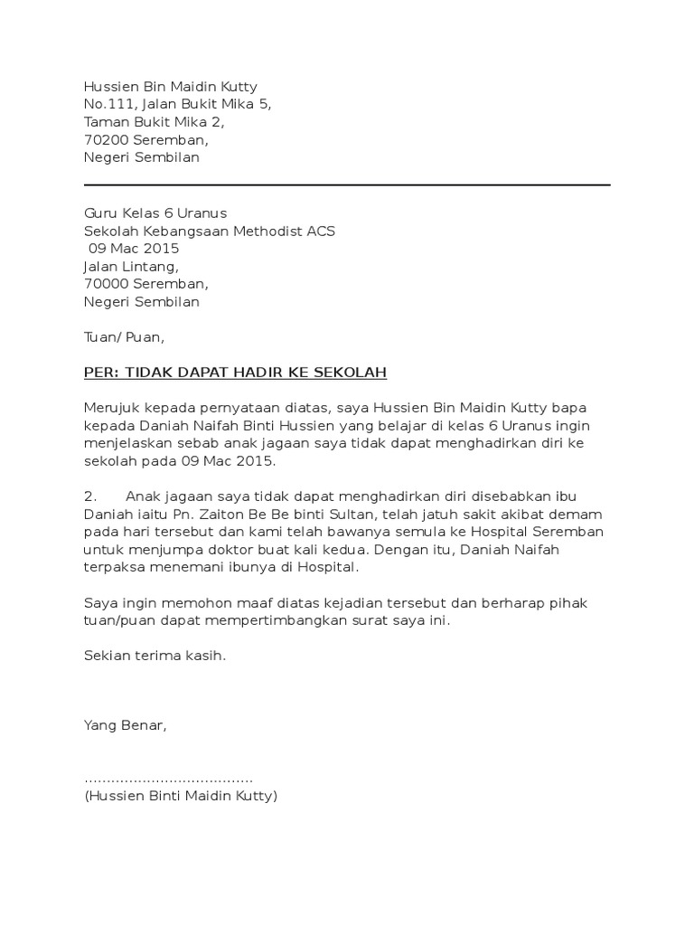 Contoh Surat Tidak Hadir Ke Sekolah Atas Pelbagai Alasan. Latih Tubi Bahasa Melayu. 5 Contoh Surat Rasmi Tidak Hadir ke Sekolah Kerana Sakit.