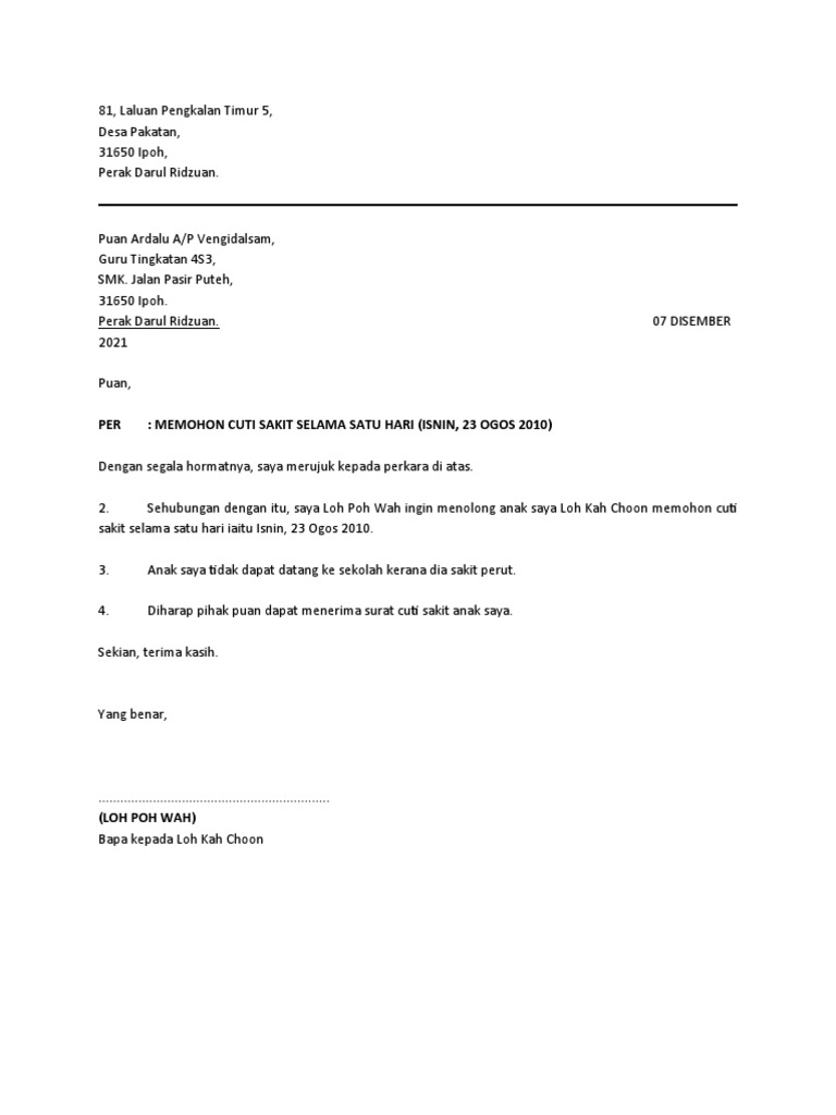 . Yang terhormat BapakIbu Guru Wali Kelas 3 SD Pelita Bangsa Di tempat Dengan hormat Saya yang bertanda tangan di bawah ini adalah orang tuawali murid dari. Kalau contohnya anda pergi buat pemeriksaan anak anda di UTC boleh dapatkan surat cuti sakit tapi perlulah mendapat pengesahan doktor yang membuat pemeriksaan tersebut. Sitihajaraishah0211 menerbitkan LAPORAN AKHIR LATIHAN INDUSTRI SITI HAJAR AISHAH BINTI ZAINUDDIN BB180041 pada 2021-09-29.